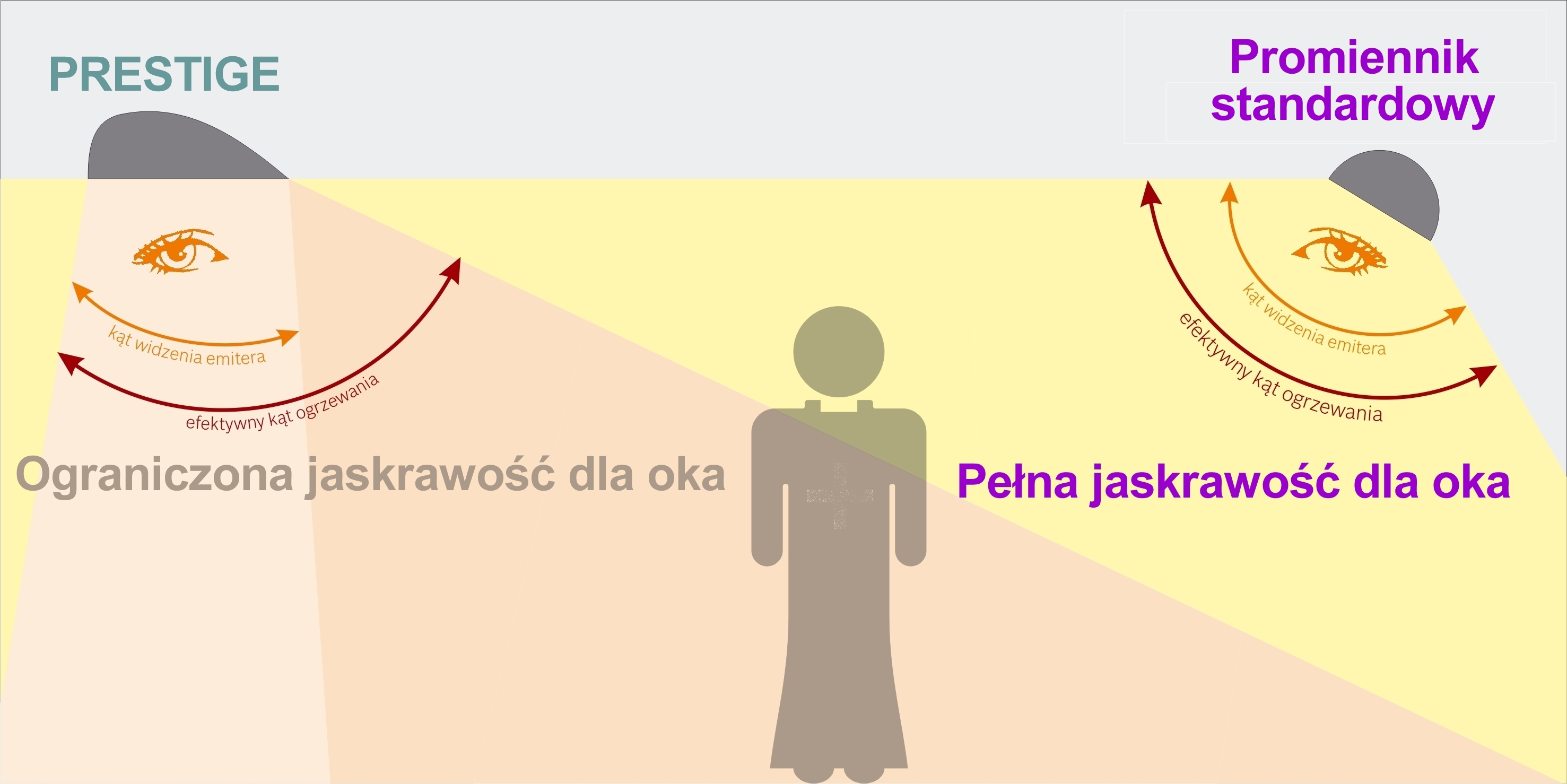 Promiennik generuje ciepło w dwóch snopach natężenia ciepła. Snop główny który ogrzewa tułów oraz snop odbity ogrzewający głowę. Dzięki takiemu precyzyjnemu podzieleniu wiązki cieplnej odbiorca nie widzi emitera a głowa ogrzewana jest delikatniejszym ciepłem zgodnie z fizjologiczną potrzebą.
